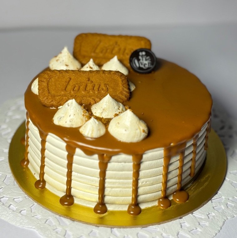 A luscious cake layered with creamy biscoff spread and topped with crunchy biscoff biscuits